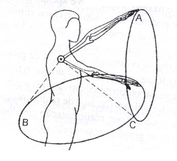 Figura 1 – Movimentos topologicamente idênticos (trajetórias circulares A e B) são executados por conjuntos diferentes de comandos motores e com a participação de grupos musculares diferentes, alcançando os mesmos alvos no espaço (ponto C) através de diferentes estratégias (modificado de Bernstein, 1967).