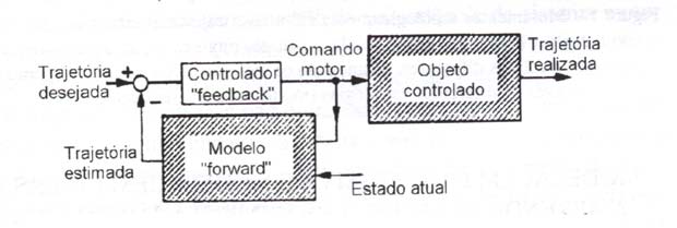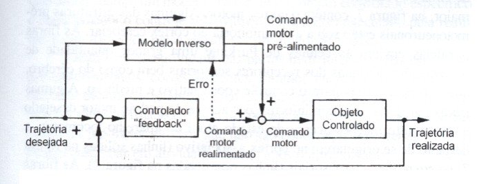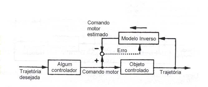 Neste esquema, o controlador por realimentação (feedback) desempenha o papel de uma aproximação linear do modelo inverso do objeto controlado, e converte o erro na trajetória em um erro no comando motor. O controlador por pré-alimentação (feedforward) não substitui o controlador por realimentação, mas adquire um modelo inverso não linear tentando reduzir o comando motor realimentado. (Kawato e Gomi, 1992a).