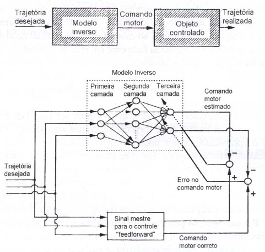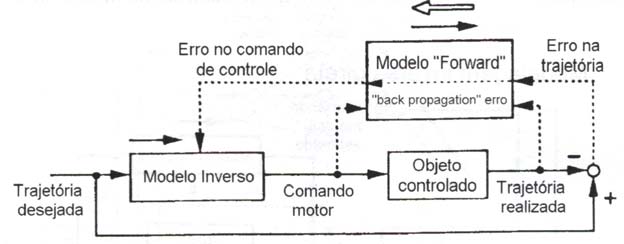 Por outro lado, uma forma de controle por pré-alimentação (feed-forward) mais sofisticada pode ser obtida por meio de um modelo inverso do objeto controlado (Atkeson, 1989). Por modelo inverso entendemos uma representação neural da transformação do movimento desejado do objeto sob controle, nos comandos motores necessários para realizar este movimento. O fato de o modelo inverso possuir características de transferência entrada-saída que são o inverso daquelas do objeto controlado, a conexão em série dos dois sistemas (progressivo e inverso) fornece aproximadamente uma função identidade (fig. 3). Se uma determinada trajetória desejada for fornecida ao modelo inverso, ao final do sistema a trajetória realizada é computada fielmente em relação à trajetória desejada, de forma que modelos inversos precisos podem ser utilizados como controladores por pré-alimentação (feedforward) ideais. Uma questão importante no desempenho do controle por pré-alimentação, portanto, é o treinamento do modelo inverso.