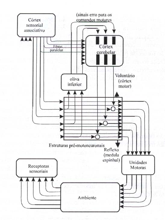 Kawato & Gomi (1992a, 1992b) propõem um modelo de aprendi-zagem motora para o cerebelo (fig. 7) baseado na aprendizagem pela realimentação do erro (feedback errar learning). As estruturas pré-motoneuronais, o córtex cerebelar, as fibras trepadeiras e a combinação de unidades motoras, o ambiente e os receptores sensoriais, na figura 7, correspondem ao controlador por realimentação (feedback), modelo inverso, sinal erro e objeto controlado da figura 6, respectivamente. As fibras musgosas transmitem informações às fibras paralelas que levam ao córtex cerebelar a informação relativa ao padrão motor desejado, bem como informações a respeito do estado atual do aparelho locomotor. Supõe-se que as respostas das fibras trepadeiras representem comandos motores gerados por algumas das estruturas pré-motoneuronais, por exemplo, controladores por realimentação ao nível da medula, do tronco encefálico e do córtex cerebral, inclusive o córtex motor.