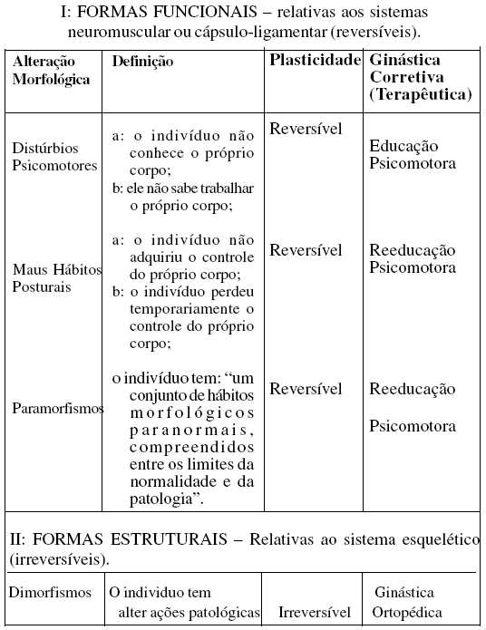 Algumas vezes, este desequilíbrio de energia associado a fatores sócio-econômicos e culturais, impostos em função de novos ritmos alimentares e rotinas de vida, condicionados ao ambiente físico e ao contexto no qual estamos inseridos, compromete nossa qualidade de vida e nos proporciona, pela falta de exercício físico e ambiente adequado de trabalho, a aquisição de doenças e problemas estruturais, causados pela relação forma orgânica, função e história de vida. Tudo isto pode agravar ou causar alterações morfológicas estruturais (Tabela I) irreversíveis como os dimorfismos (TRIBASTONE, 2001).