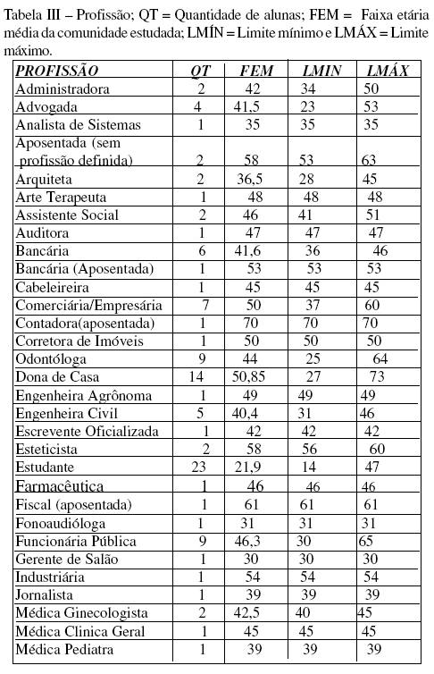 Atividades estas que levam, pela dor e mal estar que se instalam de forma lenta e gradual até se tornarem constantes, as alunas a se submeterem a diversas sessões de fisioterapia, e após, a busca da chamada manutenção da ausência da dor, feita através da atividade física postural personalizada. Dores que, conforme Knoplich (1995), são causadas pela falta de adaptação, física e psíquica, e pelo tipo de vida moderna que reflete no fato de os músculos desempenharem suas funções tensos e rígidos.Quanto à atividade profissional as alunas se organizam conforme Tabela III.