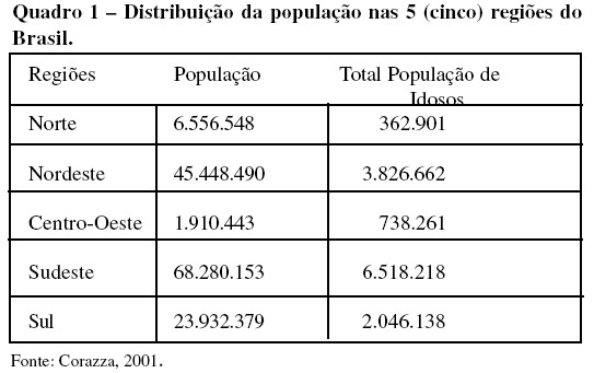 Segundo aponta a Organização Mundial de Saúde no ano de 2001 o Brasil tinha uma população total e de idosos de acordo com o quadro abaixo: