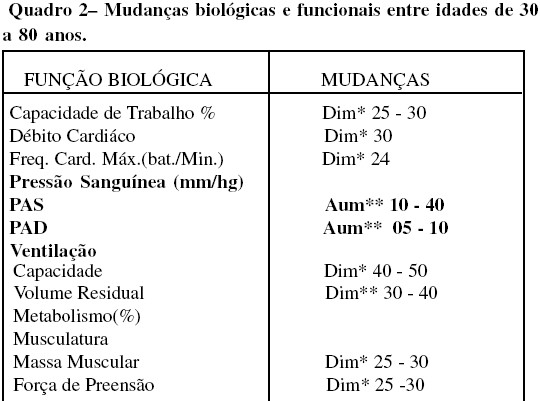 Conforme pode-se constatar, verificamos descritas no quadro a seguir algumas das principais funções fisiológicas do corpo humano, bem como as mudanças biológicas e estruturais que diminuem gradativamente e naturalmente as suas funções, tendo em vista o envelhecimento dos órgãos e tecidos, os quais atingiram o ápice de seu funcionamento durante a fase adulta.