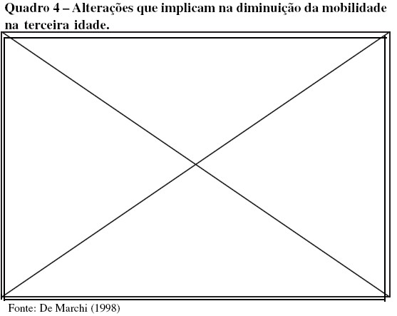 Também é importante salientar que devido às influências multifatoriais do envelhecimento, ocorrem no idoso, alterações nos reflexos de proteção e no controle do equilíbrio, prejudicando-se assim a mobilidade corporal. As funções identificadas no quadro 3 são altamente suscetíveis ao efeito da falta de atividades físicas e motoras.