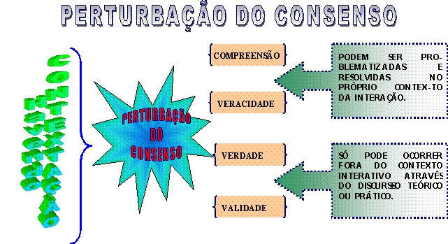 Nas situações em que a autoridade, o poder ou o dinheiro é que determinam as ações resultantes da situação de fala, como acontece predominantemente no mundo sistêmico, é impossível estabelecer uma situação lingüística ideal, aparecendo a Perturbação do Consenso, conforme Ilustração 2.