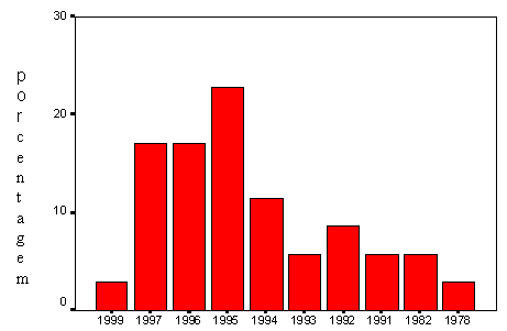 No ano de formatura temos que a maioria é formada no ano de 1995 . Quanto ao tempo de atuação como auxiliar de enfermagem a maioria tem 5 anos de trabalho na área.