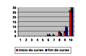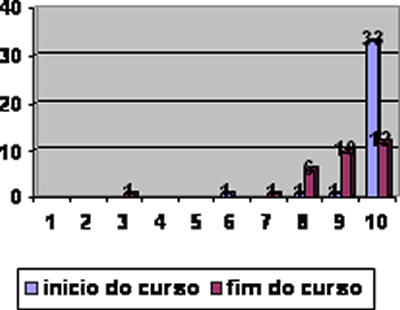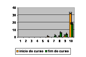 Na expectativa de mudança (inicio do curso) mensurada pelos alunos obtivemos registros de escore 10 em: mudança da qualidade 91,7 %, mudança do conhecimento 72,2 %, mudança de salário 55,6%, mudança de satisfação 88,9.