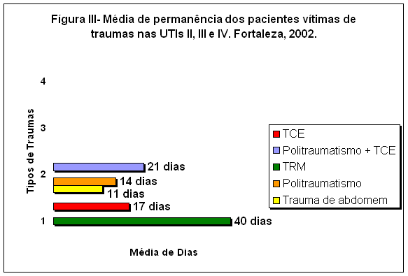 O Gráfico II mostra a média em dias de permanência nas UTIs desses pacientes. Observa-se que as vítimas de TRM permaneceram em média 40 dias, o elevado tempo de permanência talvez esteja relacionado com as complicações respiratórias e as lesões medulares alta (CINTRA, 2000). Em seguida aparecem os politraumatismos associados a TCE com média de permanência de 21 dias. Os pacientes vítimas de TCE permaneceram aproximadamente 17 dias, politraumatizados 14 dias e as vítimas de trauma de abdômen 11 dias. É importante ressaltar que as doenças neurológicas têm seu processo de recuperação lento, requer uma internação prolongada e sujeita a complicações (BRUNNER e SUDDARTH, 1990). Os dados nos permitem refletir sobre a necessidade da aplicação do processo de Enfermagem nas UTIs e conseqüentemente do planejamento da assistência (intervenções) de acordo com os diagnósticos de enfermagem. A sistematização da assistência através da utilização dos diagnósticos de enfermagem proporciona uma visão global das condições em que cada paciente se encontra, otimizando o tempo, garantindo uma assistência individualizada e de qualidade e diminuindo as seqüelas.