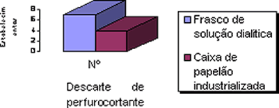 O descarte dos perfurocortantes é feito próximo à fonte de produção em dez serviços (92%). Conforme apresentado na Figura 1, em sete unidades (64%) o descarte é feito em frascos de solução dialítica e em quatro (36%) usam caixa de papelão industrializada.
