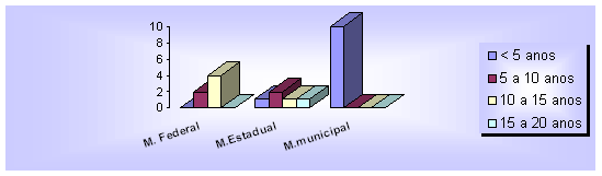 As dez enfermeiras da Maternidade Municipal atuavam há menos de cinco anos na instituição (gráfico 1), sendo que destas, quatro (19%) tinham título de especialista (Administração Hospitalar, Saúde Pública, UTI e Obstetrícia), quatro (19%) estavam cursando especialização em Obstetrícia no momento e três (14,2%) não tinham nenhuma especialização (gráfico 2).