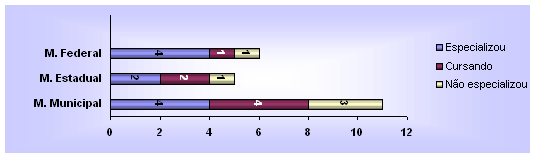 Em relação ao tempo de atuação na instituição, das seis enfermeiras da Maternidade Federal, quatro (19%) atuavam nesta instituição entre dez a quinze anos e duas (9,5%) entre cinco a dez anos (Figura 1). Em relação à titulação, quatro enfermeiras (19%) eram especialistas (Administração Hospitalar, Terapia Intensiva, Saúde Pública e Obstetrícia), uma (4,7%) cursava Especialização em Auditoria e uma (4,7%) não cursara nenhuma especialização (Figura 2).