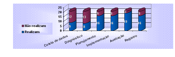Dezesseis (76,1%) entrevistadas referiram que planejam e implementam a assistência com base nos problemas apresentados a cada plantão e as outras cinco (23,8%) referiram que não planejam e não implementam ações. Diante disto, observa-se que as entrevistadas não seguem as etapas operacionais da sistematização, portanto, não detectam todas as prioridades relacionadas àas necessidades humanas básicas afetadas e com isso, provavelmente, ocorrem lacunas na implementação da assistência.