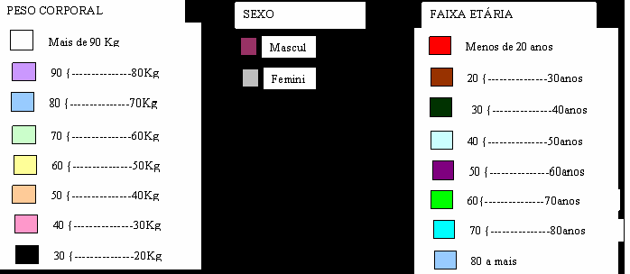 Gráfico 2 - Distribuição das características morfológicas constitucionais do corpo quanto peso corporal, identificação sexual e faixa etária dos pacientes com insuficiência cardíaca congestiva, tratados no Hospital das Clínicas/UFG-GO, no índice da investigação.