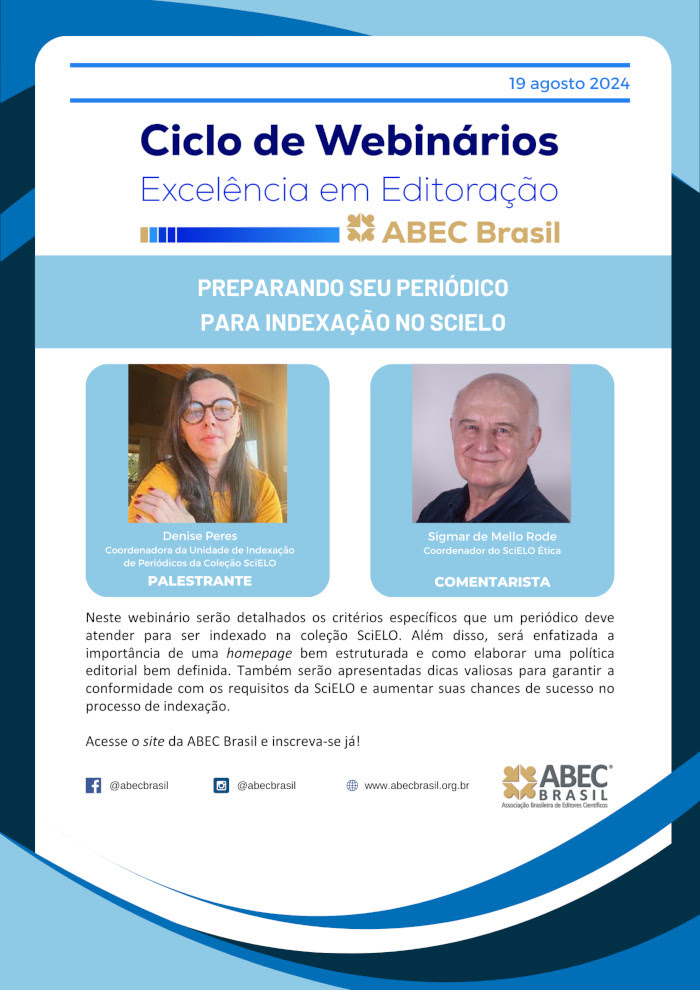Estão abertas as inscrições para o webinário Preparando seu periódico para indexação no SciELO, que acontece dia 23 de agosto das 14h às 16h, via plataforma Zoom.