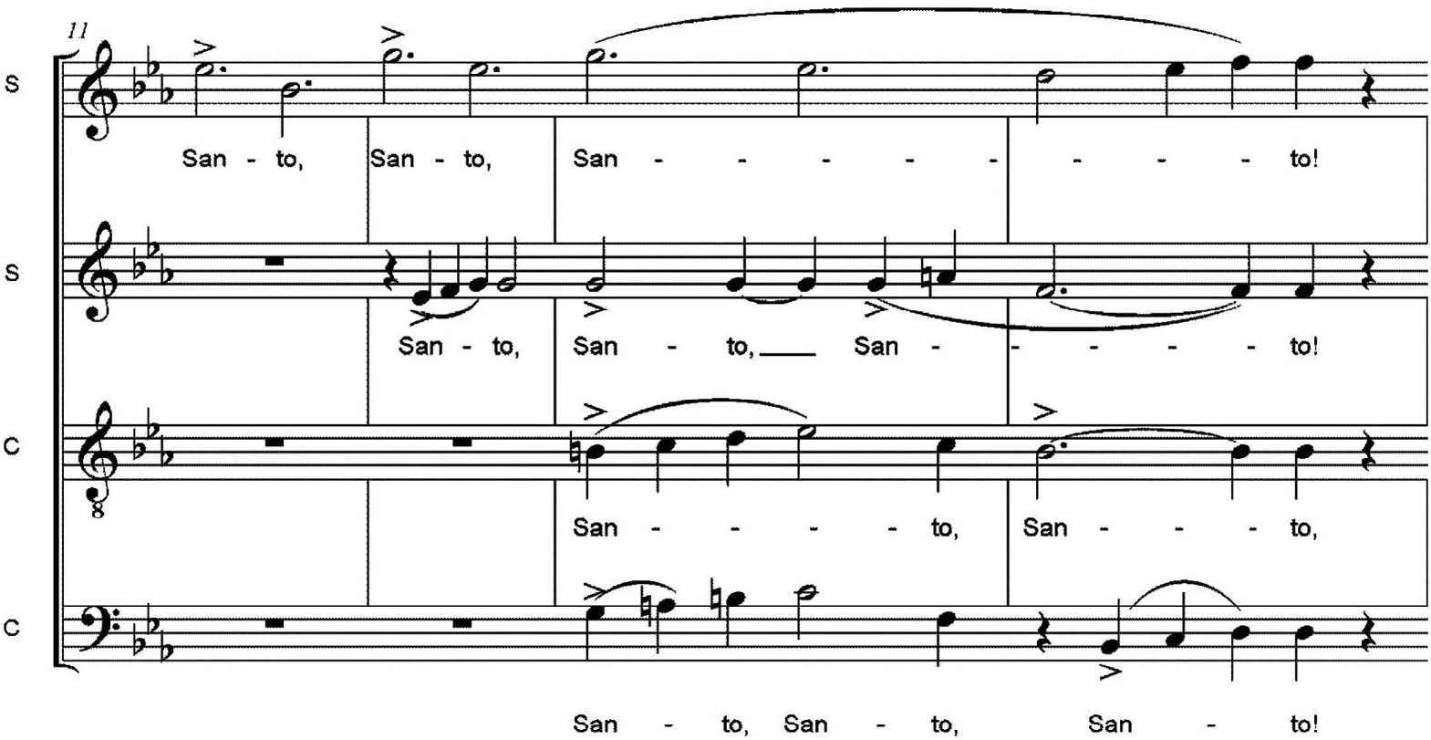 Figura 1: Santo! Santo! Santo!, compassos 11-14: vozes femininas, pontos de imitação. Copyright 2008 Reginaldo Carvalho – Todos os direitos reservados. Exemplo reproduzido com permissão do autor.