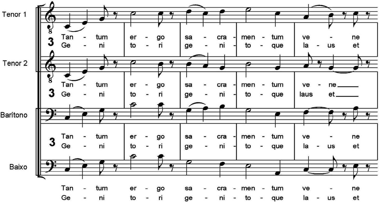 Figura 2: Tantum ergo Nº 1, compassos 1-5: vozes masculinas, homofonia. Copyright 2008 Reginaldo Carvalho. Todos os direitos reservados. Exemplo reproduzido com permissão do autor.