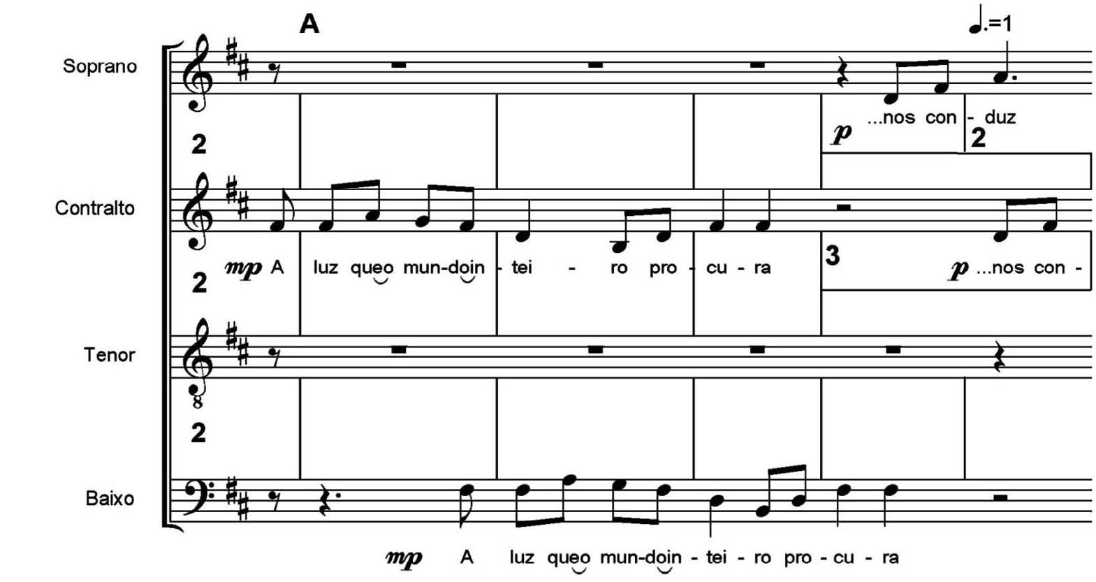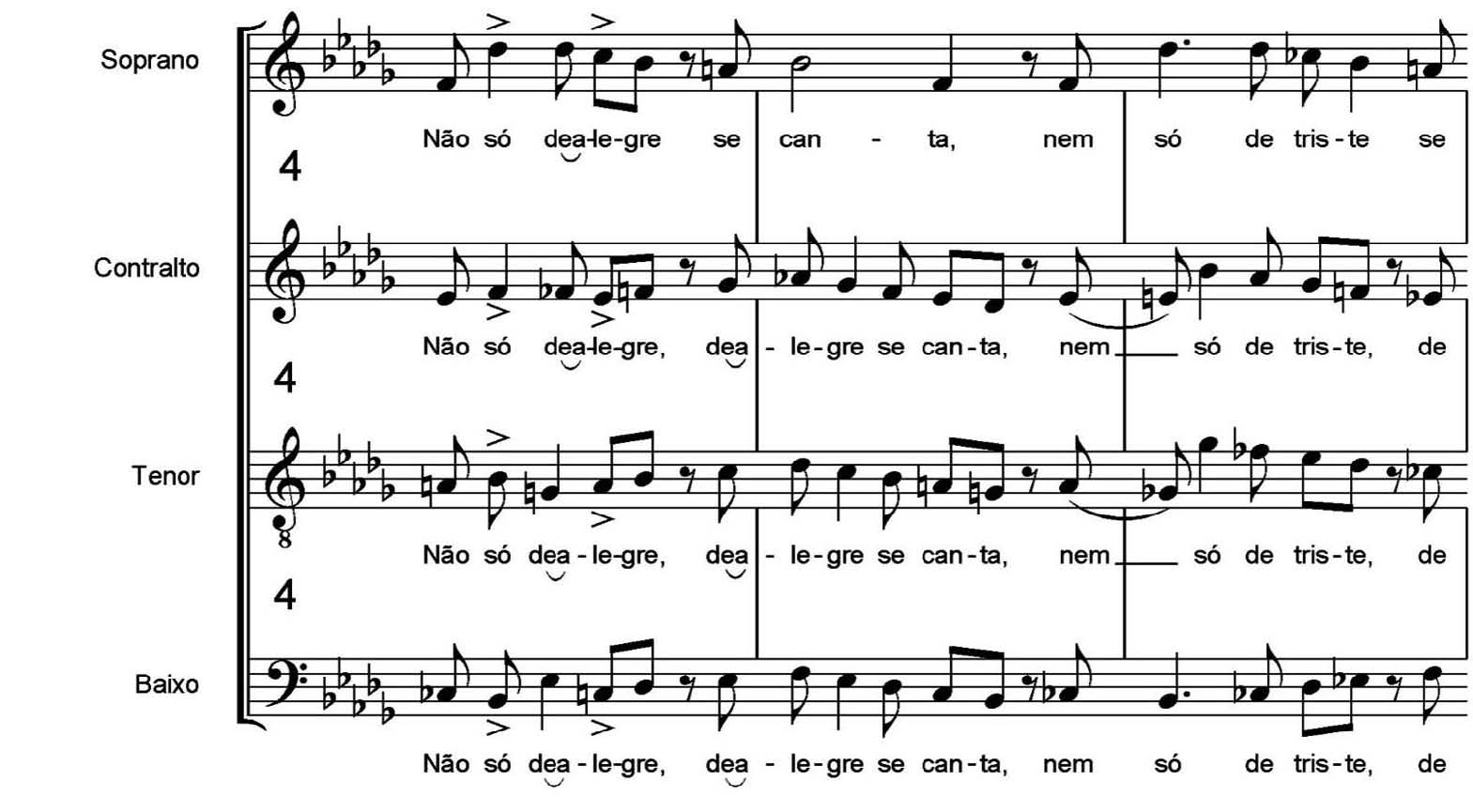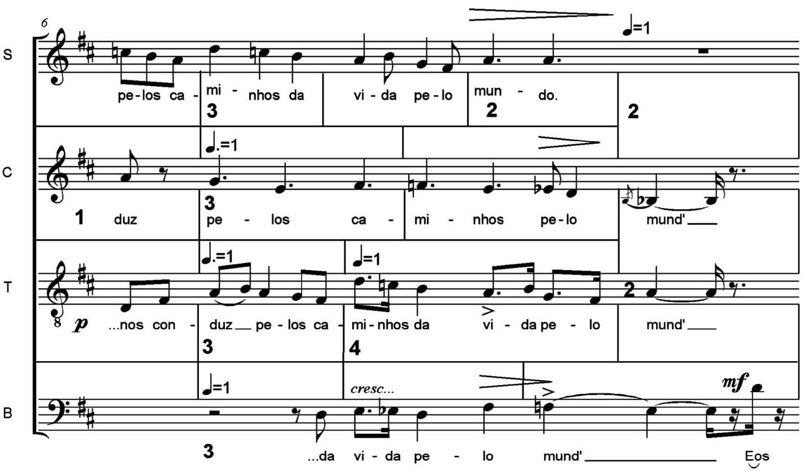 Um exemplo de complexidade rítmica pode ser encontrado na cantata Rezação, entre os compassos 1 e 10, trecho no qual as vozes cantam com métrica e agógica diferentes, criando um efeito polifônico e polirrítmico (Figura 6).