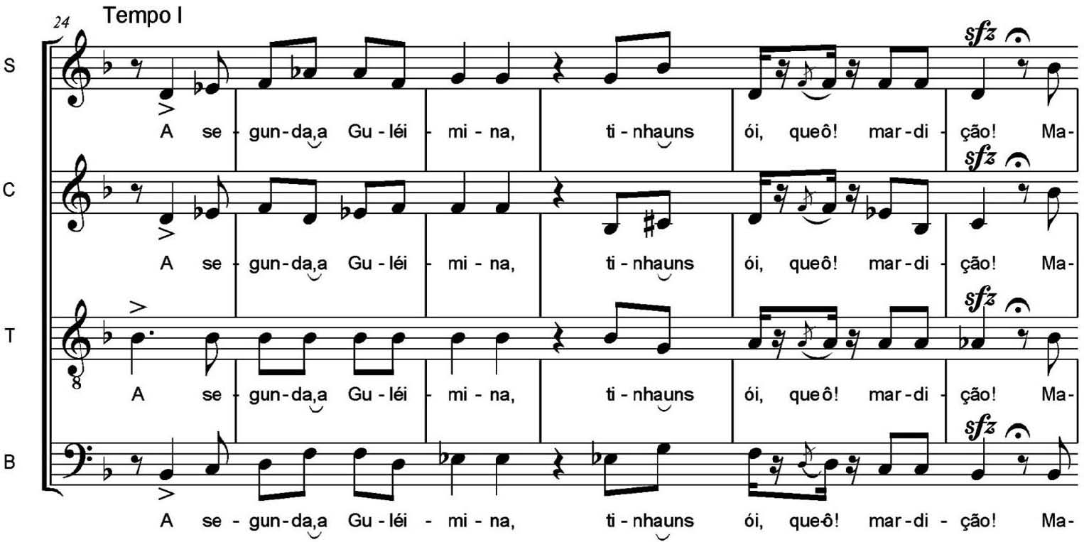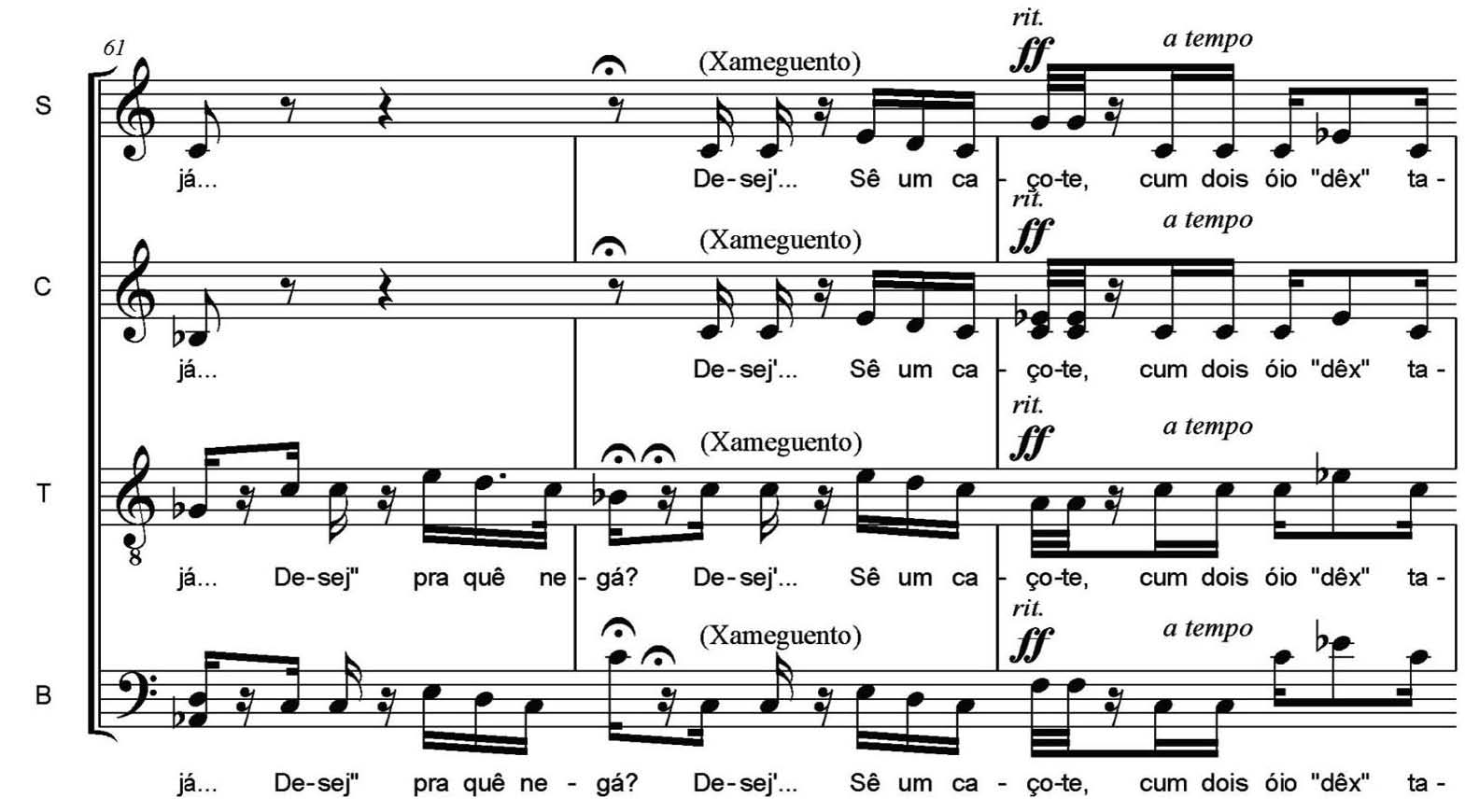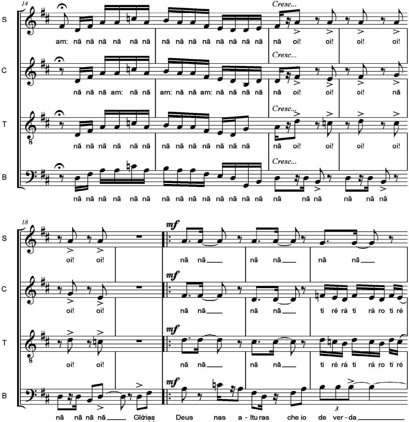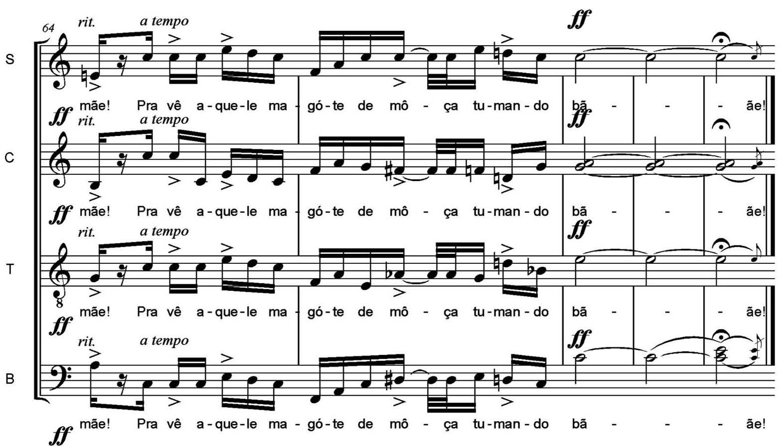 Um exemplo de complexidade rítmica pode ser encontrado na cantata Rezação, entre os compassos 1 e 10, trecho no qual as vozes cantam com métrica e agógica diferentes, criando um efeito polifônico e polirrítmico (Figura 6).