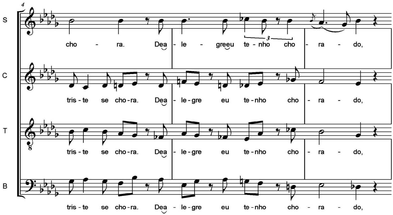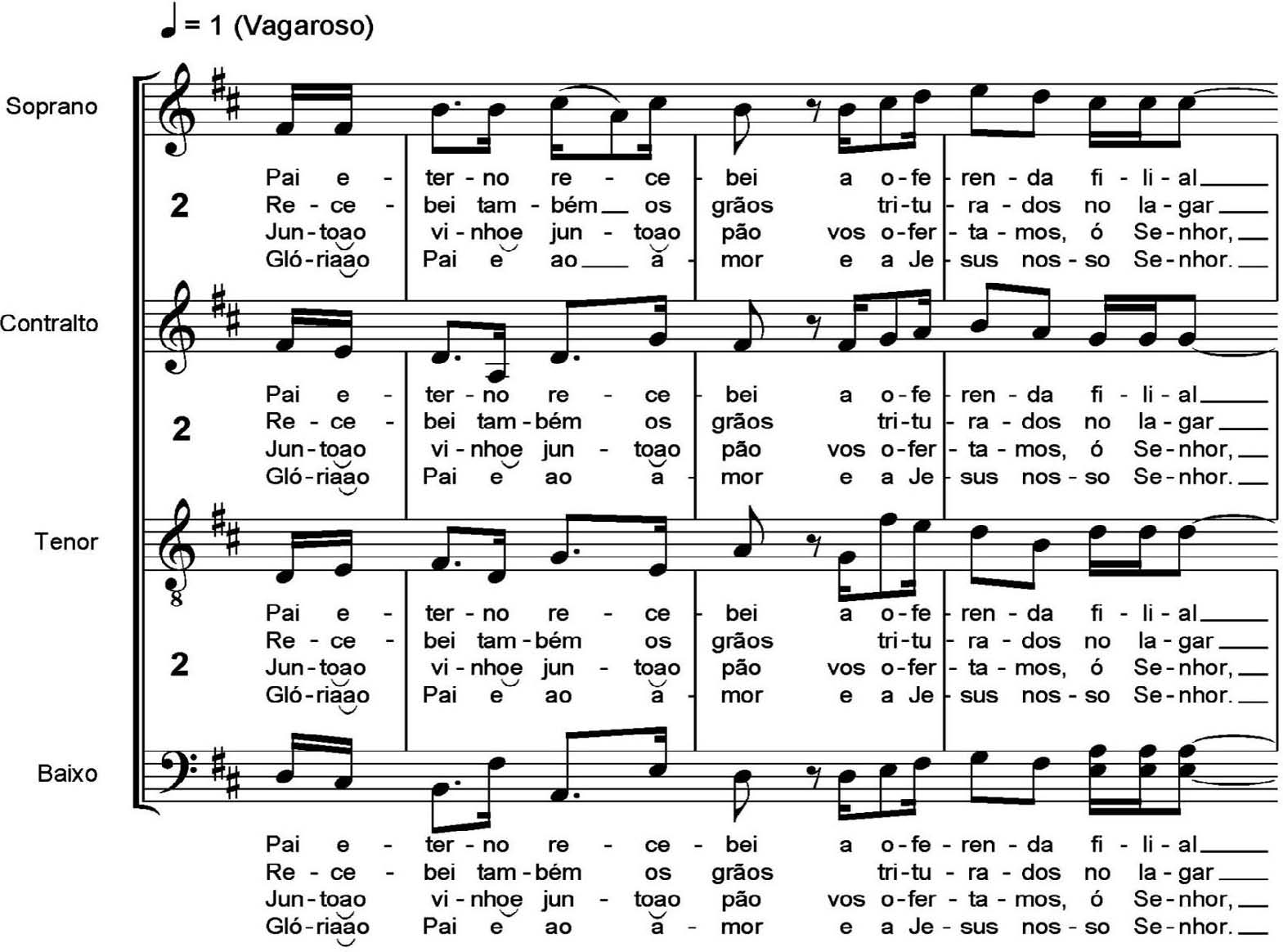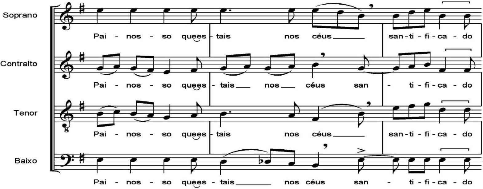 O grau de dificuldade das obras é variável. É possível encontrar composições simples, como o Salmo de Davi (Figura 13), no qual as vozes, nos múltiplos versos, cantam em uníssono com acompanhamento de órgão. A melodia, fundamentalmente construída por graus conjuntos, apresenta pequenos saltos ascendentes de terça.