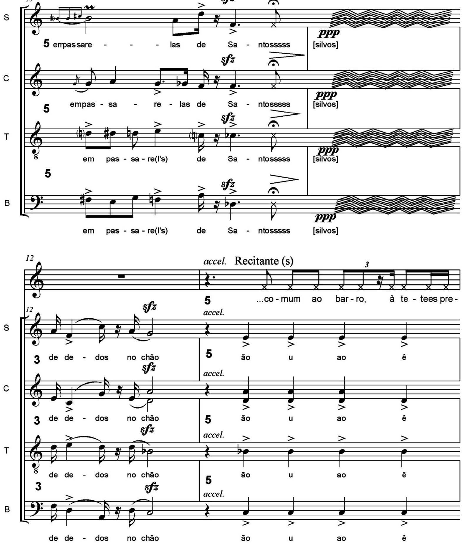 Quanto à extensão vocal das composições, Reginaldo escreve sempre numa região cômoda para todas as vozes, explorando os limites graves e agudos para fins expressivos. Este aspecto está diretamente associado à sua atividade como regente de coros escolares, infantis e infanto-juvenis, formados por diletantes e para os quais escreveu repertório original, de acordo com o nível técnico, musical e vocal, de cada um. Não obstante, o compositor, em sintonia com a música do seu tempo, explora toda a potencialidade da voz falada e/ou cantada, a fusão de sons e ruídos, a emissão de microtons e a interatividade com outras áreas artísticas, numa recorrência sistemática aos recursos extra-musicais. A obra Passarela dos Santos contém um trecho aleatório, no qual indica a produção de silvos e recitativo para voz falada (Figura 5).