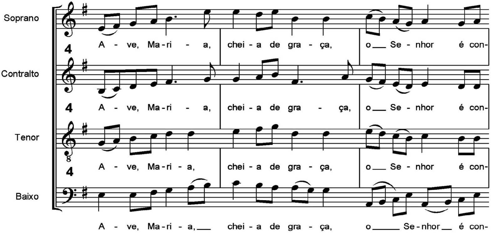 Figura 8: Ave, Maria!, compassos 1-3, mi menor. Copyright 2008 Reginaldo Carvalho. Todos os direitos reservados. Exemplo reproduzido com permissão do autor.
