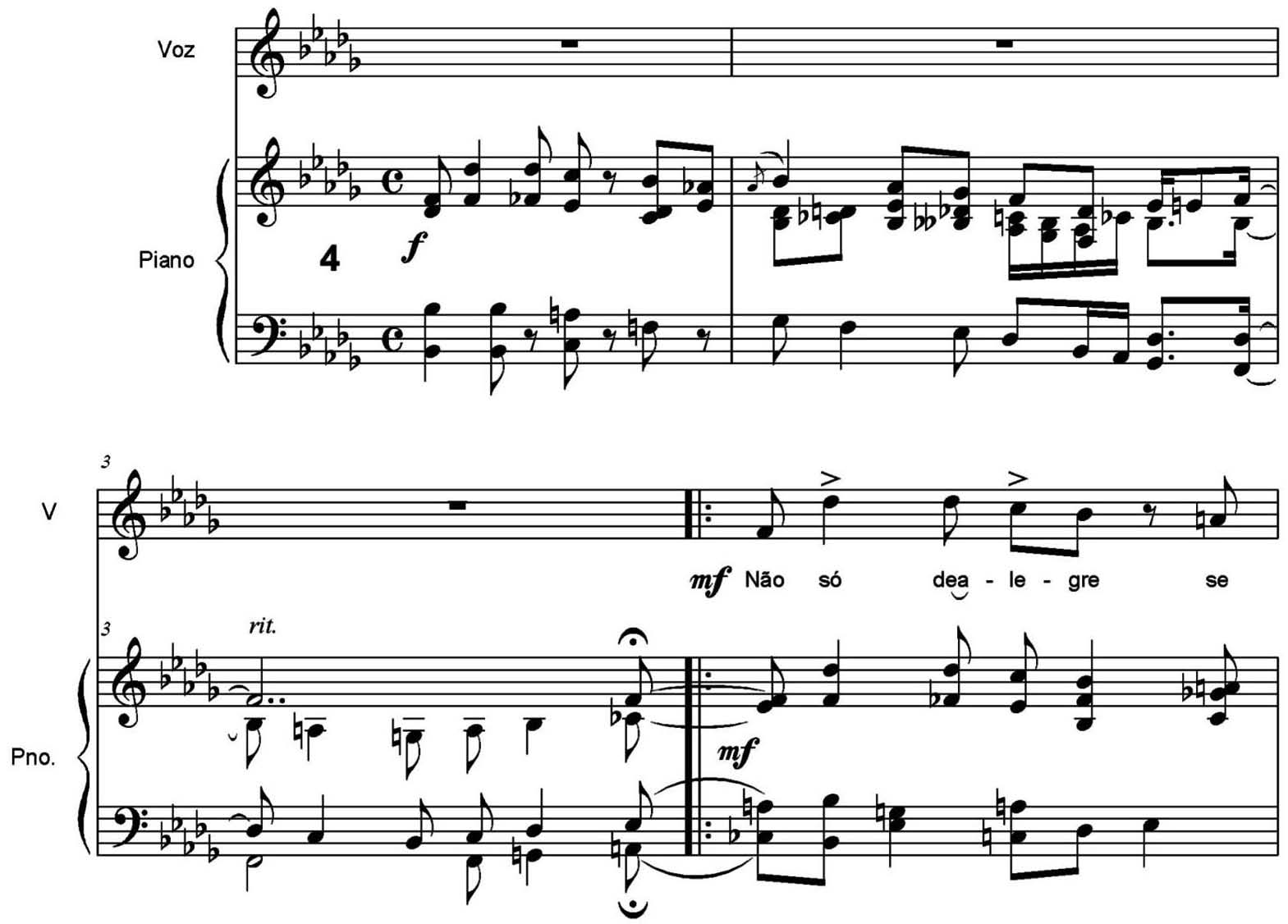 Reginaldo escreveu diferentes versões da mesma composição. É o caso de Trovas populares Nº 1, obra escrita para voz e piano (Figura 9) e também para coro a cappella (Figura 10). Fundamentalmente, as duas peças mantêm a mesma estrutura harmônica, melódica, textual e formal, variando em pequenos detalhes, neste caso, na introdução.