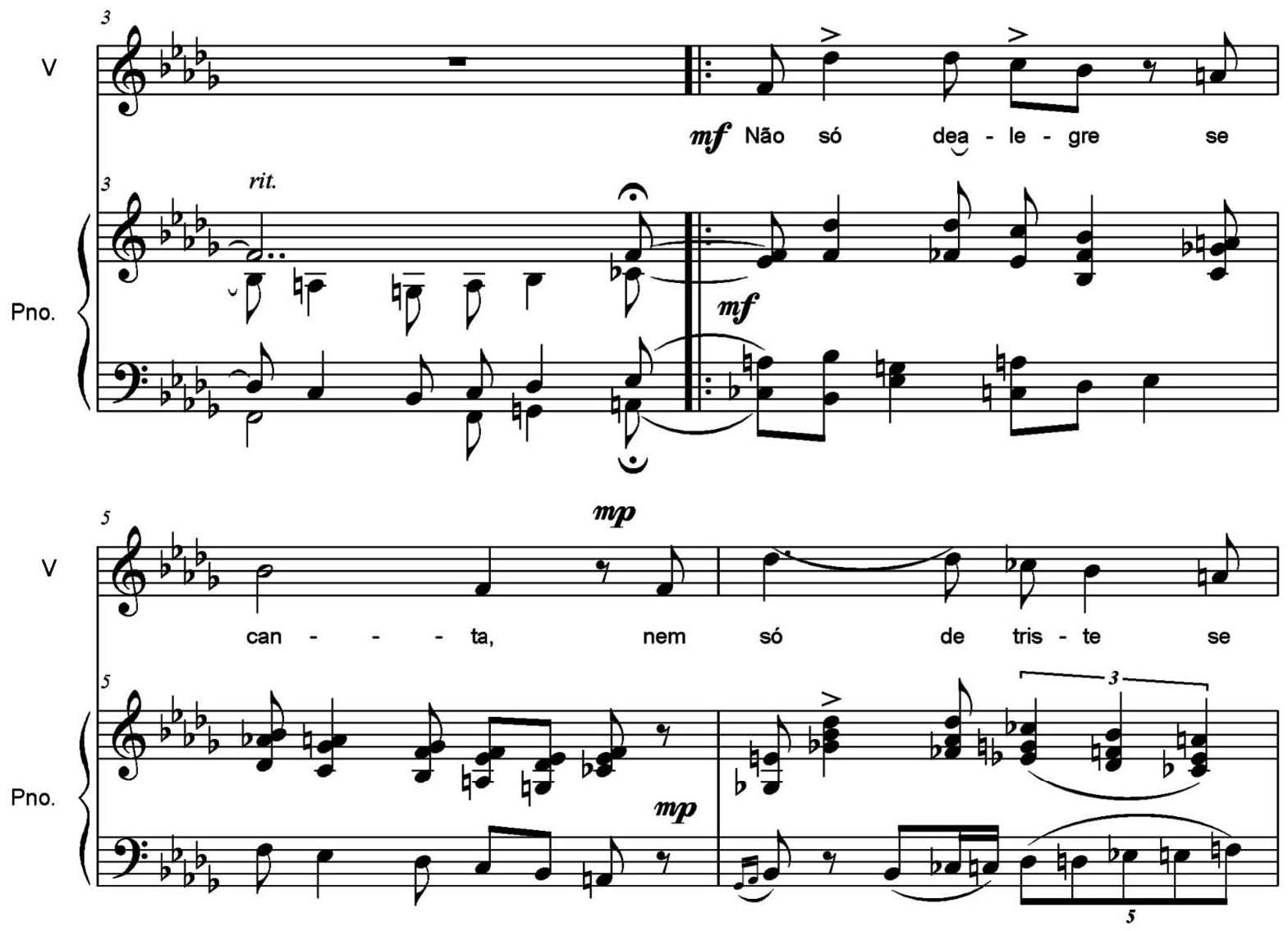 Figura 9: Trovas populares Nº 1, compassos 1-6, voz solo e piano. Copyright 2008 Reginaldo Carvalho. Todos os direitos reservados. Exemplo reproduzido com permissão do autor.