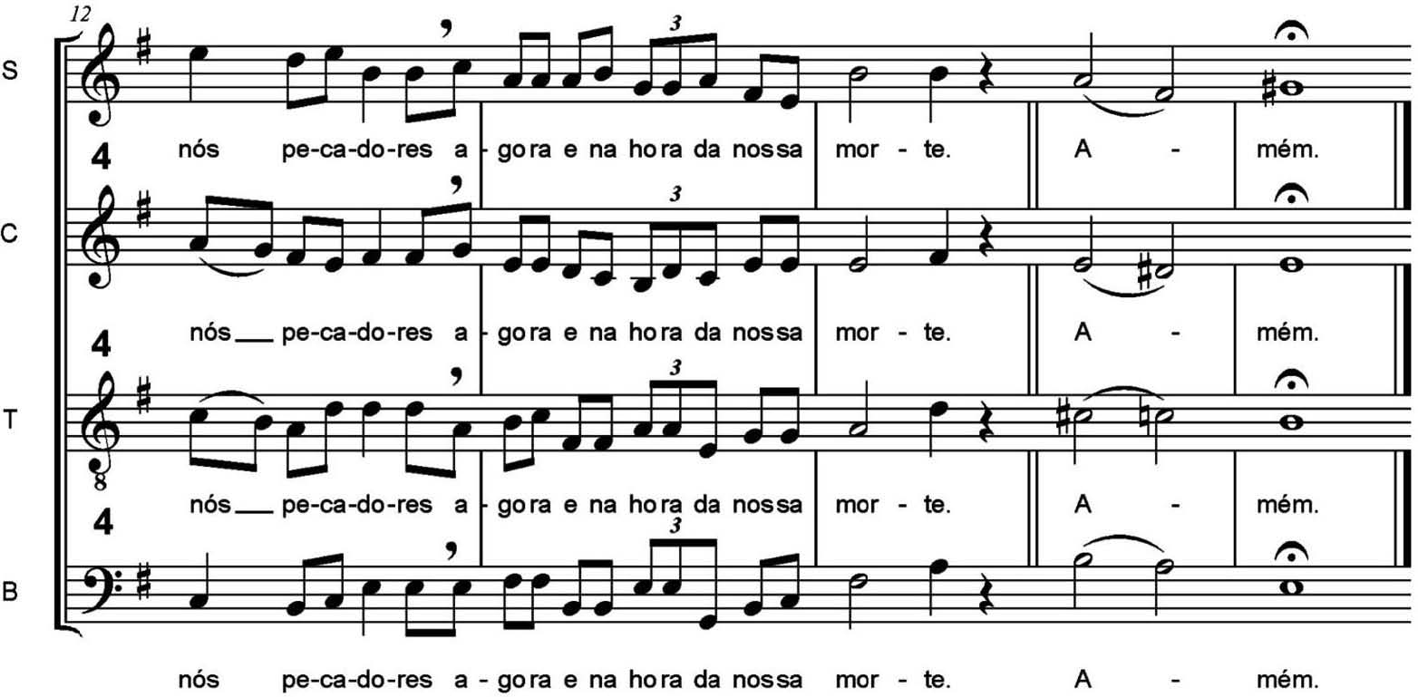 A picardia e a imprevisibilidade das progressões harmônicas, por exemplo, sublinham este aspecto particular da sua produção. Até mesmo no repertório sacro, Reginaldo brinca com o casual e o inesperado, como é possível observar na cadência que conclui a Ave, Maria! (Figura 11). Neste caso, o compositor parece enfatizar as expectativas do pós-vida e da eternidade.