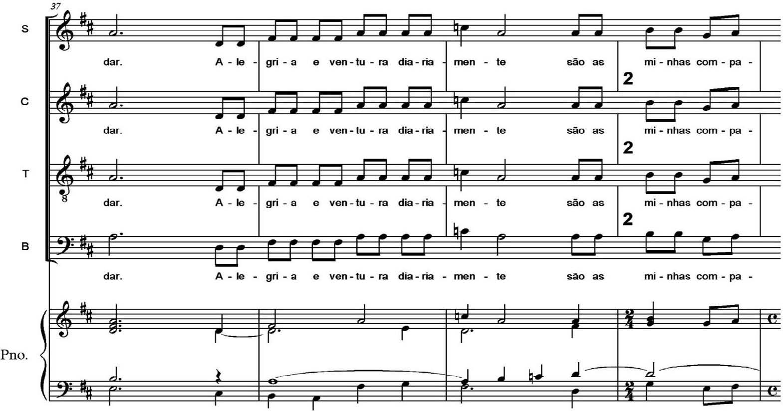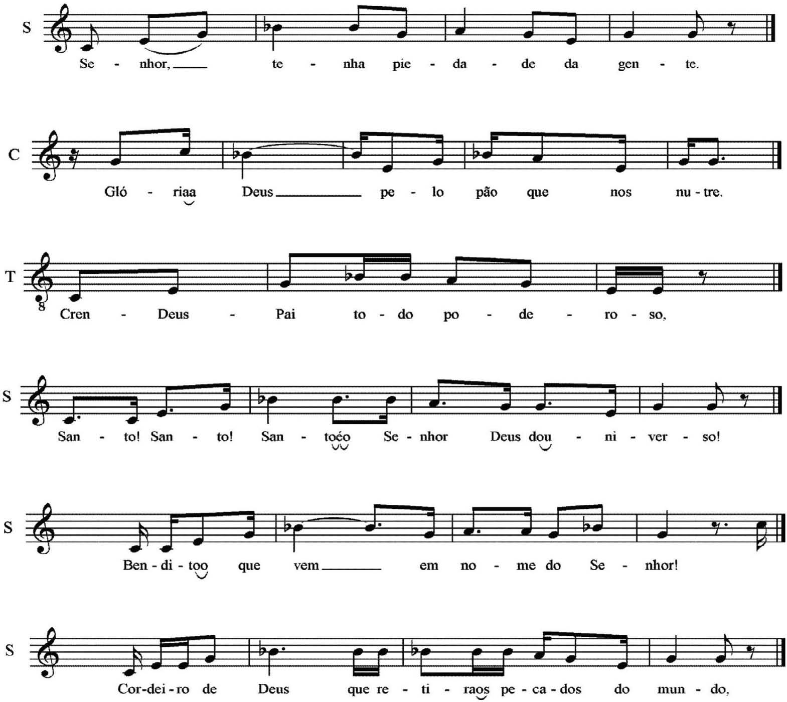 À semelhança de outros compositores brasileiros que escreveram missas baseadas nos elementos idiossincráticos da cultura musical brasileira, como, por exemplo, Carlos Alberto Pinto Fonseca (Missa Afro-Brasileira), Lindemberg Cardoso (Missa Nordestina) e Clóvis Pereira (Grande Missa Nordestina), Reginaldo Carvalho compôs a Missa Sertaneja, para coro misto a quatro vozes, uma missa cíclica que está dividida em seis partes: Senhor, Glória, CrenDeusPai, Santo, Bendito e Cordeiro de Deus. O tema inicial de um cada dos movimentos é construído sobre o modo mixolídio e a vivacidade rítmica é predominante em toda a obra (Figura 15).