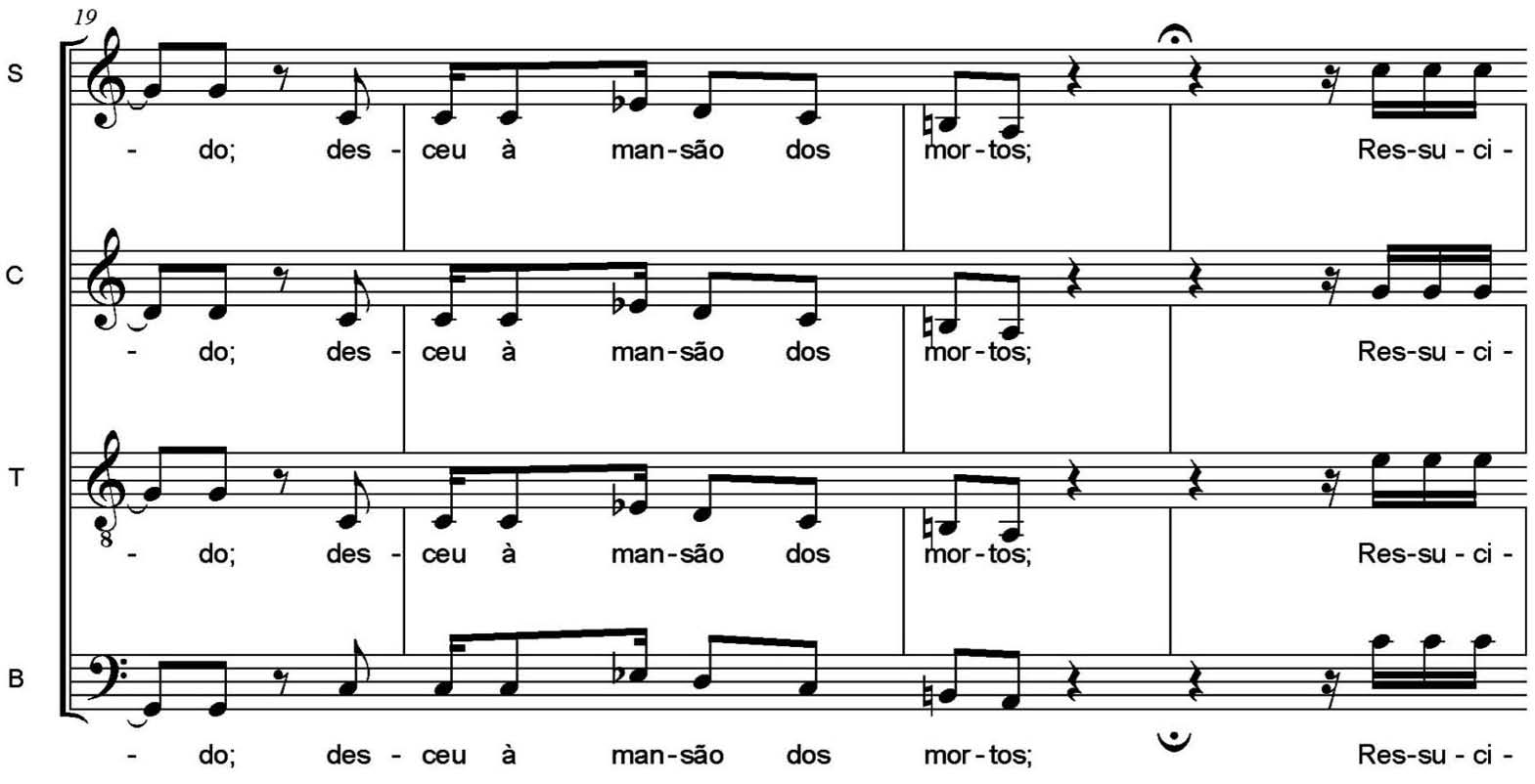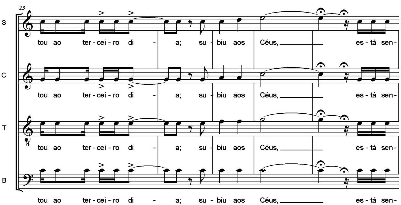 O simbolismo é outro aspecto relevante da Missa Sertaneja. Reginaldo faz uso sistemático de elementos retóricos musicais para dar sentido ao texto religioso. Quando fala, por exemplo, no CrenDeusPai, da crucificação de Cristo, entre os compassos 19 e 21, apresenta o coro em uníssono, na região grave e no modo menor, como sugere a nota mi bemol; por outro lado, quando trata da ressurreição, entre os compassos 22 e 27, a polifonia reaparece, o ritmo é incisivo e acentuado, o coro canta, no registro médio, um acorde de dó maior, estático, recitativo, no qual soprano, contralto e tenor, ao mudarem a disposição do acorde, atingem o clímax agudo quando chegam à palavra céus. As pausas e a fermata entre os compassos 21 e 22 reforçam a expressividade da seção, isto é, ao silêncio temporário da morte, aqui representado na figura retórica do suspira-tio (Bartel, 1997, p. 392), segue-se o som inebriante e vitorioso da ressurreição (Figura 16).