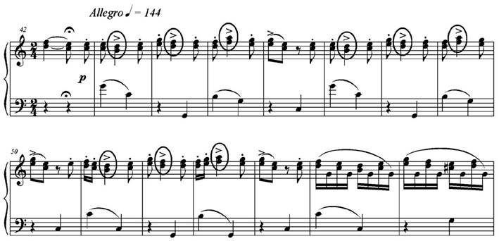 Outro exemplo que reflete o pensamento sinfônico de Liszt de repetir um mesmo fragmento melódico em diversos registros, buscando expandir a tessitura do piano, aparece em A Sertaneja no trecho ornamental con grazia da área temática C (c.39-42) que desce da dominante à tônica em tercinas seguidas de semicolcheias (veja Exemplo 6 acima). Deve-se observar o caráter idiomático desta escrita, cuja confortável posição fechada de mão direita abarca todo o fragmento que se repete, em saltos, em oitavas cada vez mais agudas. Procedimentos semelhantes, utilizando cruzamento de mãos ou mudanças de posição com saltos, podem ser encontrados também em fragmentos das áreas temáticas A, E, G, H, I e J.