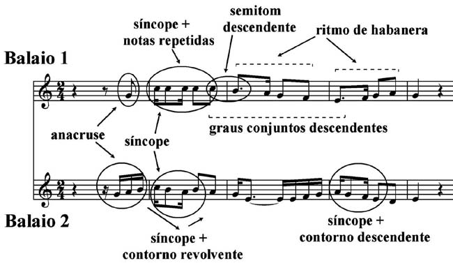 Outra alternativa, entretanto, dentro da perspectiva de uma análise motívica e de recorrência de materiais temáticos derivados - direta ou indiretamente – dos dois fragmentos de Balaio, meu bem, balaio, pode explicar melhor a escrita do compositor como um processo composicional mais claro, mais estruturado e mais unificado. O Exemplo 2 mostra as melodias e os diversos motivos das versões Balaio 1 e Balaio 2 que Brasílio Itiberê utilizou em A Sertaneja (NEVES, 1996, p. 69). Deve-se observar que o típico ritmo do acompanhamento da habanera, que aparece na melodia do Balaio 1, foi se tornando cada vez mais comum entre os compositores brasileiros do tango brasileiro no repertório erudito de salão e do choro ao final da segunda metade do século XIX. Por outro lado, a recorrência destes motivos – ou de seus elementos rítmicos e intervalares, revela que Brasílio Itiberê não estava alheio às práticas composicionais de desenvolvimento motívico e economia de meios da tradição germânica, especialmente sistematizados por Haydn e Beethoven.