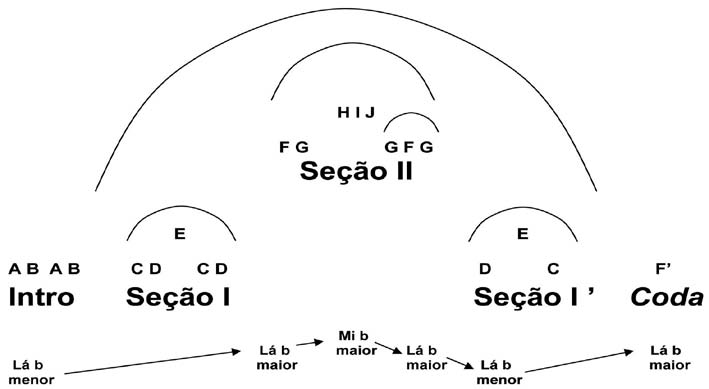 Exemplo 3: Esquema harmônico e esquema formal em arcos (níveis macro, médio e micro) com Áreas temáticas A, B, C, D, E, F, G, H, I e J em A sertaneja de Brasílio Itiberê.