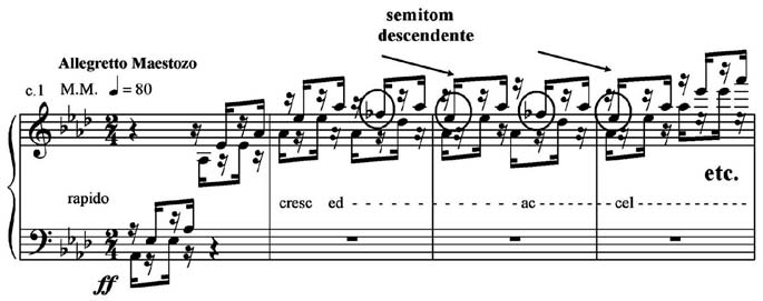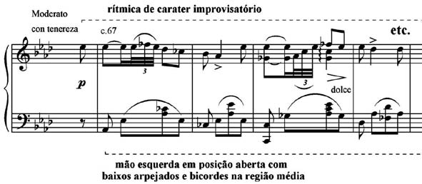 A área temática A (Exemplo 4), que evoca arpejos pirotécnicos lisztinianos enfatiza o III e o VI graus abaixados, por meio do empréstimo do modo homônimo menor, a segunda descendente motívica Fá b – Mi b (e depois Dó b – Si b) - e evita, estrategicamente, a terça do acorde da tônica de Lá b, para tornar mais sutil a utilização da mistura modal Lá b maior – Lá bemol menor.