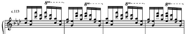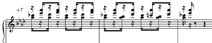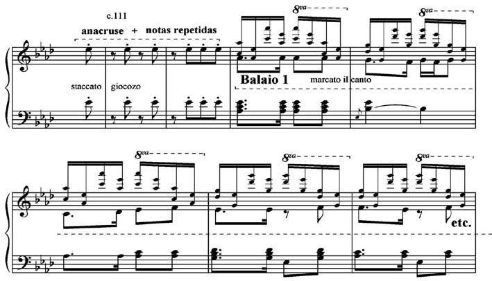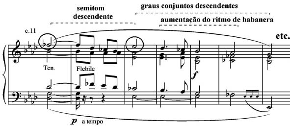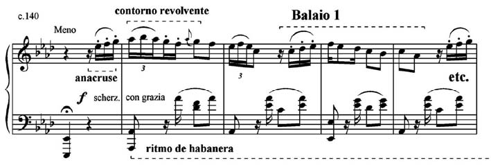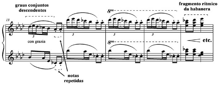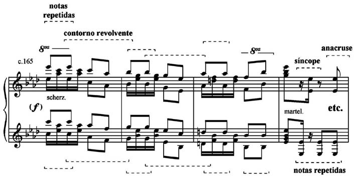 A área temática C (Exemplo 6) utiliza, primeiro, o motivo de graus conjuntos descendentes ornamentado com mordente com o motivo das notas repetidas, cujo contraste entre si é evidenciado pelas articulações legato e staccato. Depois, lança mão das duas colcheias seguidas, ritmo tirado do motivo da habanera. A repetição dos motivos em oitavas, cada vez mais agudas, reflete uma prática do pianismo sinfônico de Liszt.