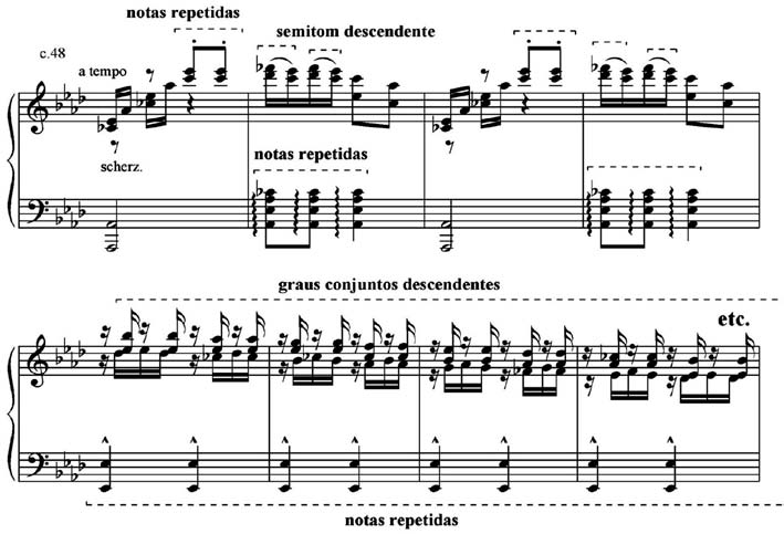 A área temática D (Exemplo 7), que também se inicia com frases direcionadas para o registro agudo, recorre, dentro de seu caráter pomposo, ao motivo de notas repetidas, ao motivo do semitom descendente Fá b – Mi b e ao motivo dos graus conjuntos descendentes.
