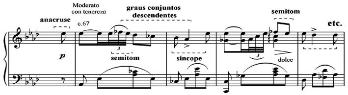 Na lírica área temática E (Exemplo 8), Brasílio Itiberê utiliza os motivos da anacruse, do semitom descendente Fá b – Mi b, dos graus conjuntos descendentes e da síncope. Seus 16 compassos refletem uma fraseologia tradicional com um período paralelo de duas frases que se repete na oitava superior. A mudança para um caráter mais intimista e a quadratura exemplar desta seção apontam para uma posição destacada no esquema formal em arco desta obra predominantemente virtuosística, O estilo de melodia acompanhada é remanescente de Chopin (ou da modinha), como será mostrado no Exemplo 19 e Exemplo 20, mais à frente.