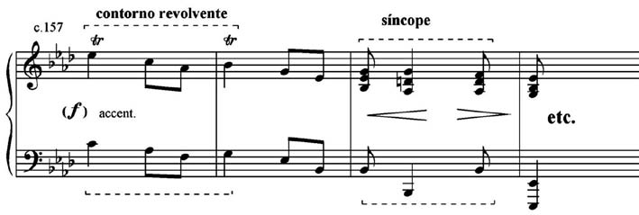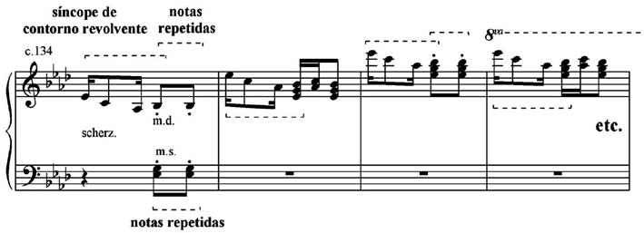 A área temática J (Exemplo 13), por meio do motivo das notas repetidas, do motivo do contorno revolvente e de uma combinação dos motivos da síncope e da anacruse, faz referência à sonoridade sinfônica coral de Liszt, em que as mãos do pianista se ocupam para realizar quatro vozes de natureza homofônica.