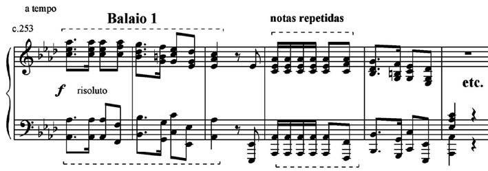 A área temática H (Exemplo 11) contem recorrências quase literais do Balaio 2 (ornamentado por mordentes em tercinas) e, assim como a área temática E na Seção I, sua quadratura exemplar de período paralelo repetido na oitava superior, a coloca em destaque na parte superior do arco da Seção II, que ocupa o centro da obra. O motivo do ritmo da habanera é aqui utilizado na sua forma mais comum, ou seja, de acompanhamento.