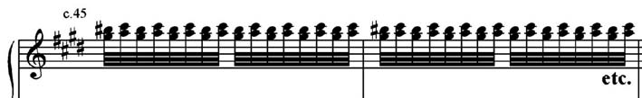A admiração de Brasílio Itiberê pela escrita virtuosística de Liszt fica evidente se compararmos alguns trechos de A Sertaneja com o Soneto 104 del Petrarca (1849), peça do segundo livro dos anos de peregrinação (LISZT, 1993). Por exemplo, a típica figuração da escrita idiomática do piano, em que a mão direita se superpõe à mão esquerda no c.44 do Soneto, o que reflete sua abordagem sinfônica do teclado, pode ser encontrada também no c.26 de A Sertaneja (Exemplo 15 e Exemplo 16). Embora notadas de maneiras diferentes, ambas as passagens resultam em uma sonoridade típica que simula os trinados múltiplos ou tremoli das cordas orquestrais.