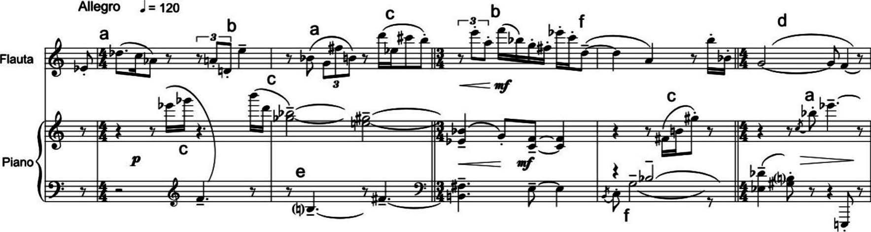 Música é escrita em três movimentos: Largo, Allegro e Largo. O primeiro movimento desenvolve a idéia que está condensada na frase geradora mostrada na Figura 1. Essa frase inicia-se num crescendo com um grupo de três fusas e uma pausa (a) e, aos poucos, vai adensando-se – aparece uma tercina (b), um grupo de quatro fusas (c), notas simultâneas, colcheia pontuada (d) – até culminar no forte. Em seguida, a frase é “fechada” pelo decrescendo natural do acorde sustentado pelo piano, ao qual são sobrepostos E@ e F$ na região aguda. Os elementos da frase descrita acima (densidade, Figuração rítmica e dinâmica) e a sua estrutura como um todo serão reproduzidos em todas as seções do Largo.