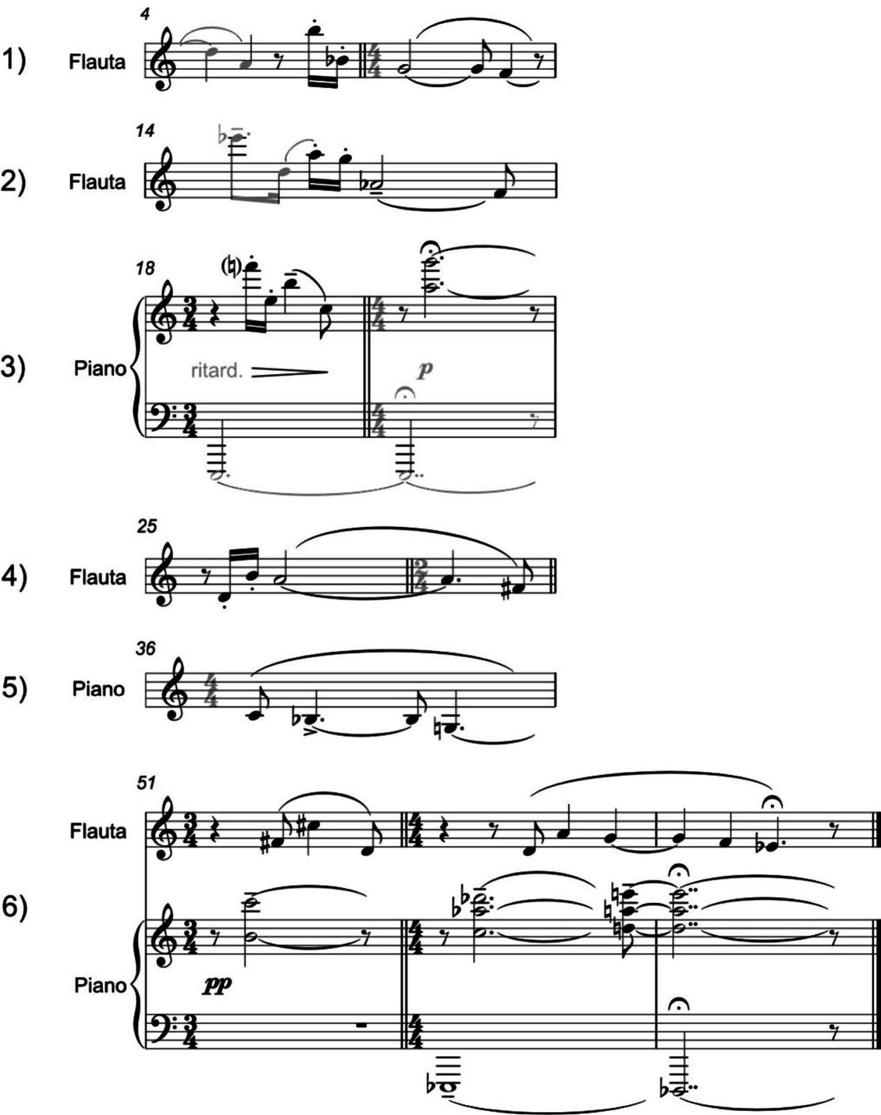 Exemplo nº 9: Guerra Peixe, Música, II. Allegro, motivo d, finais de frase: 1) Exposição; 2) 1ª variação; 3) 2ª intervenção solo do piano; 4) 2ª variação; 5) 4ª intervenção solo do piano; 6) 4ª variação.