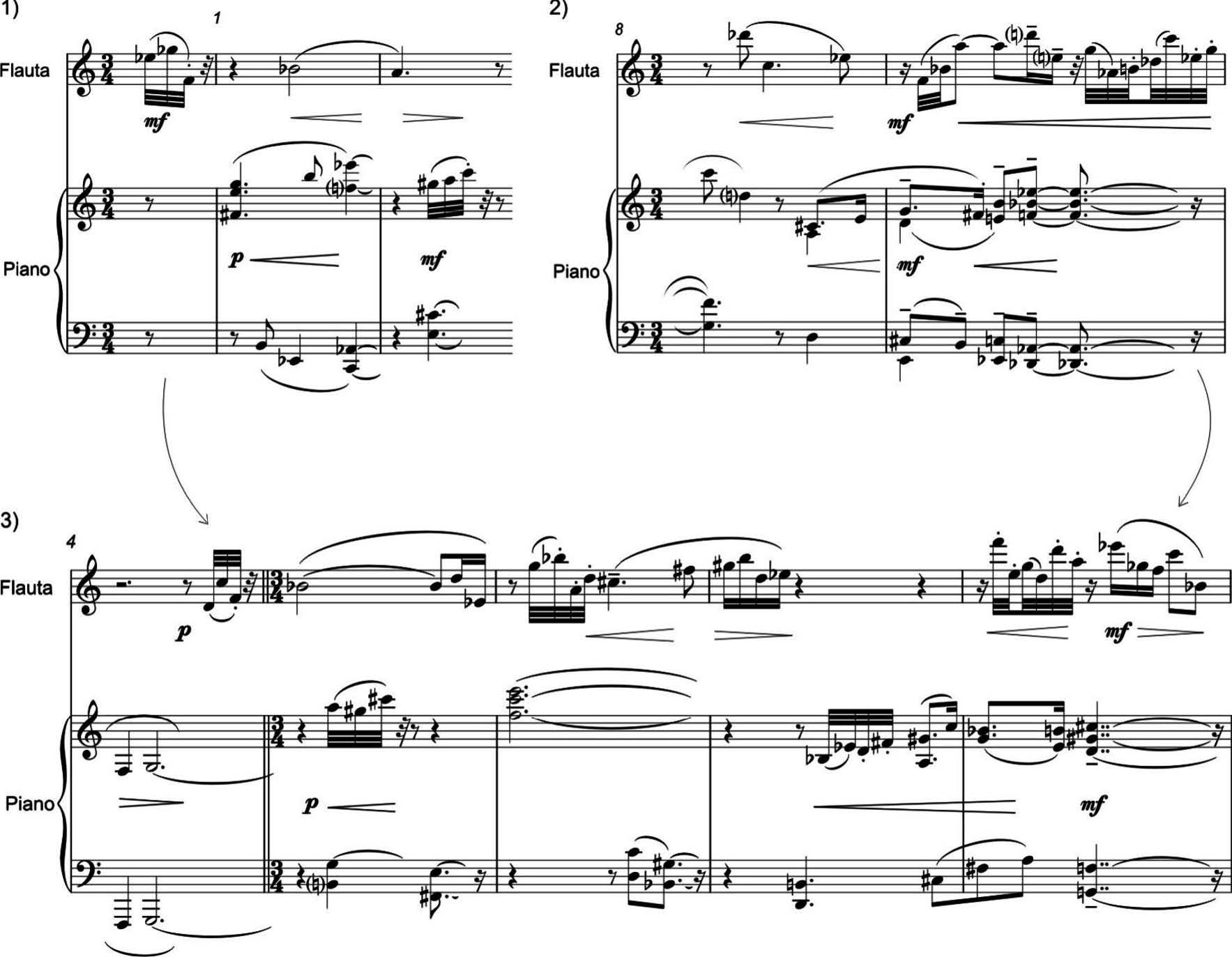 Entretanto, o que define a Exposição não são os motivos, que funcionam como “palavras”, mas o próprio “argumento” a ser dito (Figura 10): um diálogo entre a flauta e o piano (1) apresenta a idéia geradora (ársis/tésis), iniciando uma frase que vai se adensando até atingir o ponto de maior tensão (2) que, em seguida, será conduzido ao repouso (3). Esse “argumento” será sempre reproposto nas variações. Os motivos e acordes continuarão sendo variados e combinados entre si, mas é mantida, em linhas gerais, a estrutura da frase da Exposição, como pode ser visto na sua comparação com a 1ª variação (Figura s 10 e 11).