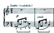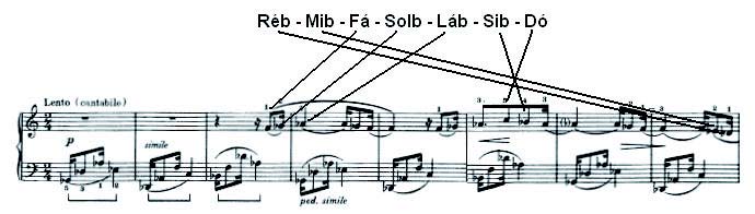 Este motivo sustenta a melodia cantabile que se desenvolverá em A, a partir do compasso 4 (com anacruse em 3) centrada em Réb, e expondo a sua escala diatônica através de uma expansão que se estende até o compasso 8. Com a utilização do Réb neste oitavo compasso, toda a escala heptacordal (diatônica) foi apresentada na linha melódica. Vale observar que os três primeiros compassos também apresentam toda a escala no motivo de acompanhamento. O Exemplo 2 demonstra a relação entre a linha melódica e a escala de Réb.