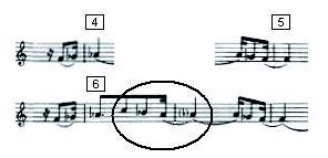 Exemplo 4: Compassos 3-8 - construção do segundo membro da frase a por inserção de motivo.