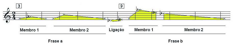 O esquema fraseológico desta melodia é bastante interessante, denotando um especial refinamento do compositor na elaboração do tamanho e, principalmente nas subdivisões das frases, estabelecendo uma assimetria entre os membros de frase (2 e 3 compassos de duração) ao mesmo tempo que constituí uma simetria irregular entre as frases (5 e 5 compassos de duração). Pode-se compreender então a Seção A como um Período binário. A Tabela 1 exemplifica melhor esta divisão: