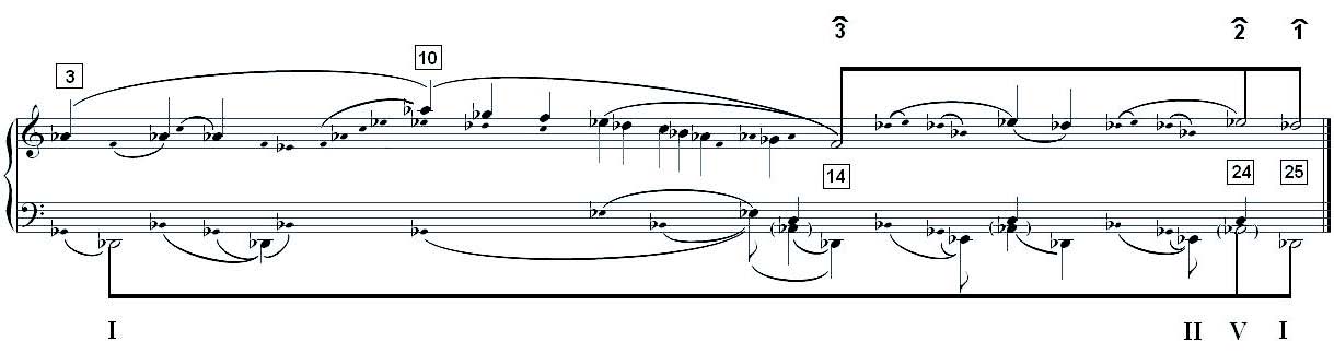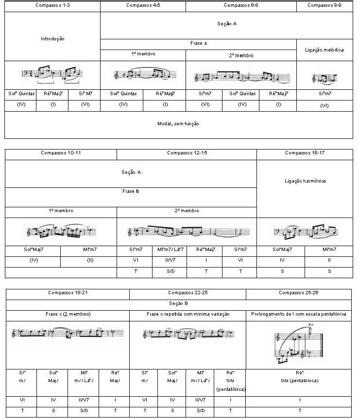 -Sib é descendente, o que, aliado a não utilização de nenhum acorde com função dominante, fortalece a sensação de modalismo, especificamente o Réb Jônico, devido a linha melódica articulada a partir do compasso 4. Nos compassos 10-12 o Réb é substituído pelo Mib, não alterando a progressão final ascendente (Solb - Sib).