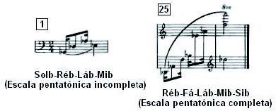 O primeiro acorde da peça não é um acorde de estrutura triádica. Ele representa um fragmento da escala pentatônica, podendo ser disposto em quintas superpostas a partir do Solb. A escala pentatônica é, assim como o modalismo e o tonalismo, um elemento importante para a compreensão da estrutura harmônica da peça, visto que sua utilização é transversal aos dois idiomas. O Exemplo 8 mostra os acordes que respectivamente iniciam e finalizam a peça, listando as alturas que correspondem à escala pentatônica.