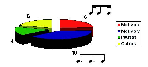 A porcentagem dos motivos utilizados na peça pode ser apreciada na figura 01 que realça a grande concentração motívica utilizada por Santoro nesta peça. Consideramos o motivo x a figura semicolcheia-colcheiasemicolcheia (Exemplo 5) e o motivo y a figura colcheia pontuada-colcheia pontuada-colcheia (Exemplo 6).